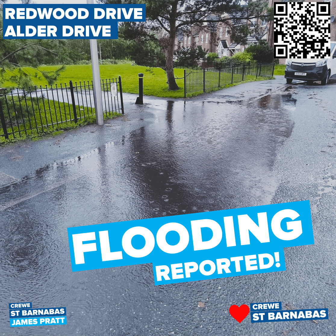 Out and about with recent bad weather I noticed the flooding at the end of Alder Drive near Redwood Drive - this is making it difficult to access the footpath due to the standing water.