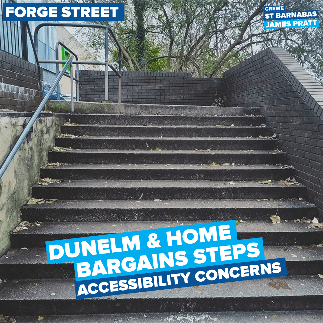 Ideally, a ramp would provide proper access for everyone. Residents have told me that even a handrail on both sides of the steps would make a huge difference, especially for shoppers to Dunelm, Home Bargains, and even those passing through to Tesco on foot or by other means.