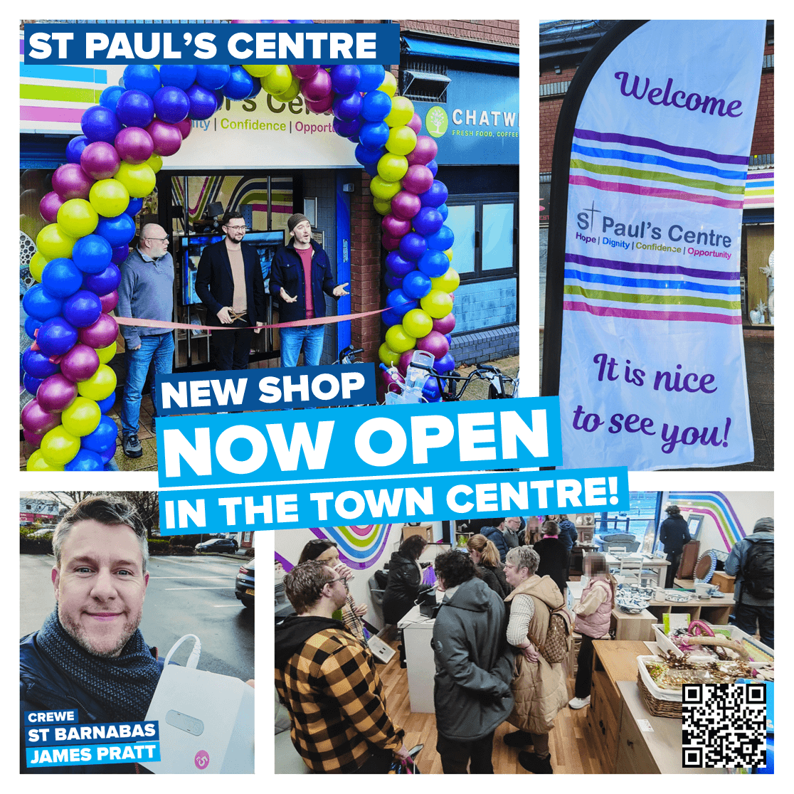 The shop’s bright branding represents Hope, Dignity, Confidence and Opportunity, reflecting everything St Paul’s brings to our community in Crewe. Every pound spent goes straight back into supporting local people.