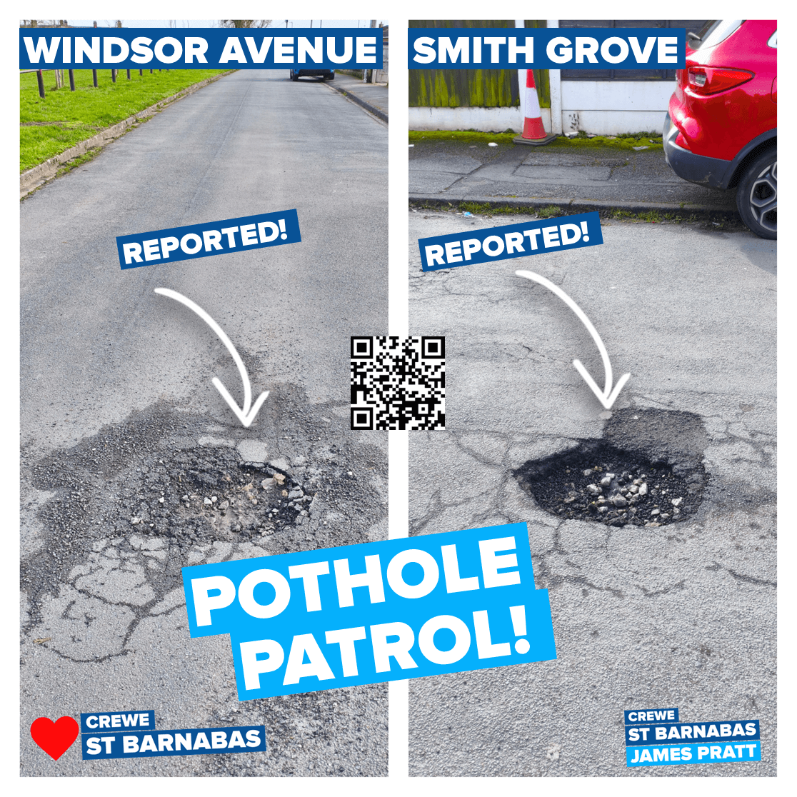 Some of the potholes were repaired last week, which is welcome progress. However, a number appear to have been conveniently missed, and I have reported those again to ensure they are properly addressed. Some potholes on West Street have also been patched, but more permanent repairs are still needed. Iβm hoping to be able to announce something on this soon.